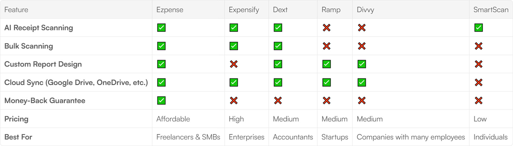 Managing business expenses efficiently is crucial for freelancers, accountants, and small business owners. With several expense management tools available, choosing the right one can be overwhelming. In this article, we’ll explore the top 5 expense tracking solutions and see how Ezpense compares to leading competitors like Expensify, Dext, Ramp, Divvy, SmartScan, Navan, and SparkReceipt.